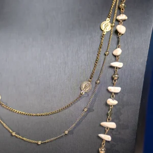 Nosite občutek narave. Ta unikatna, večplastna verižica v topli zlati barvi združuje surovo lepoto naravnih kamenčkov in drobne simbole, ki šepetajo zgodbe – o zemlji, svetlobi, tišini in vas samih. Vsak kamenček je neponovljiv, rojen iz narave, vsak detajl premišljen. Nič umetnega, nič bleščečega – le čista, prvinska energija. Popolna za ljubiteljice naravnega, boemskega ali minimalističnega sloga. Za vsak dan, za dušo.