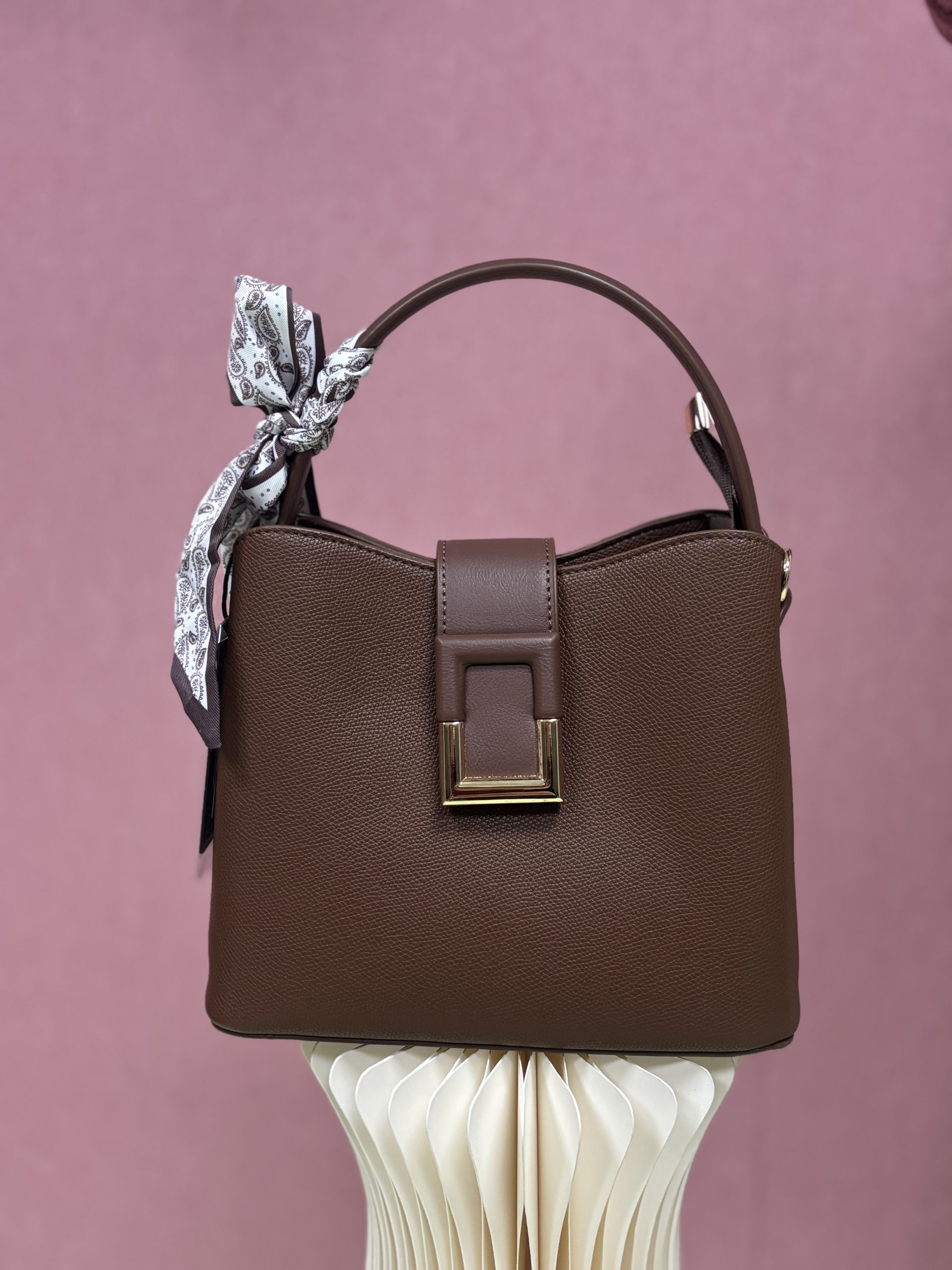 Dodajte piko na i svojemu videzu s to čudovito žensko torbico, ki navdušuje s svojo klasično “box” obliko in premišljenimi modernimi detajli. Izdelana je iz trpežnega umetnega usnja s prefinjeno teksturo, njen osrednji element pa predstavlja elegantna zaponka v kombinaciji z zlatim okovjem, ki poskrbi za varen in hkrati prestižen zaključek. Torbica je zasnovana za sodobno žensko, ki potrebuje praktičnost, zato ponuja dovolj prostora za telefon, denarnico in kozmetiko, hkrati pa s priloženo snemljivo okrasno rutico na ročaju omogoča hitro stilsko preobrazbo iz dnevnega v večerni videz. Ne glede na to, ali izberete nežne pastelne tone za spomladansko svežino ali klasične temne odtenke za poslovno eleganco, bo ta torbica v vsaki barvni različici poskrbela za dovršen in urejen videz, ki zagotovo ne bo ostal neopažen.