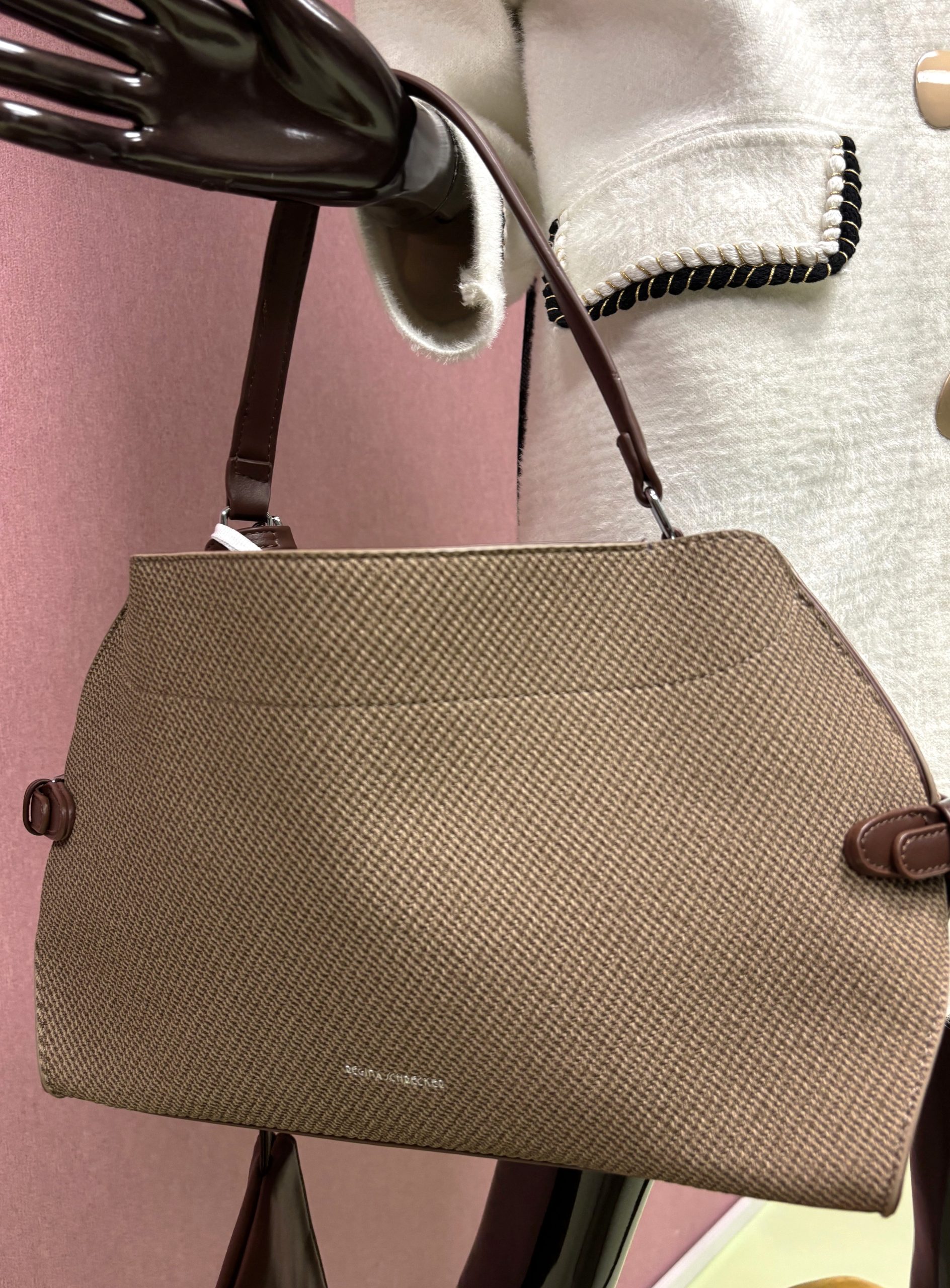 Ta elegantna ramenska torbica se ponaša z markantno, strukturirano obliko, ki v sprednjem delu spominja na klasično frame torbico. Izdelana je iz prefinjene, teksturirane tkanine s tweed vzorcem v toplih, nevtralnih odtenkih rjave in bež barve, kar ji daje brezčasen in prefinjen videz. Torbica je poudarjena z gladkimi usnjenimi detajli in ročaji v temno rjavi barvi, ki ustvarjajo eleganten kontrast in poudarjajo njeno kakovost. Torbico lahko nosite na rami s priloženim pasom ali v roki, in predstavlja popoln dodatek za popestritev vsakega elegantnega, poslovnega ali klasičnega videza.