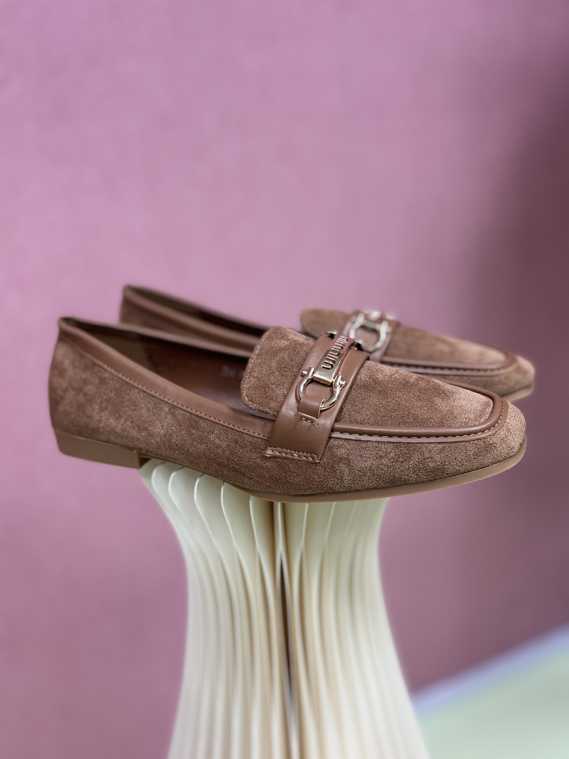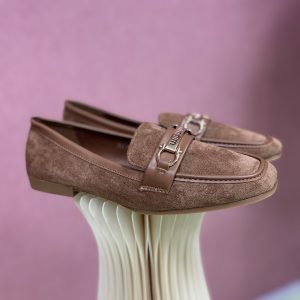 Mokasini imajo dodano subtilno zlato sponki, ki poudari preprost, a prefinjen dizajn. Podplat je tanek in fleksibilen, primeren za hojo po mestu ali sproščen poslovni slog. Kamelj barva daje občutek topline in naravnosti, zaradi česar so mokasini idealna izbira za vsakodnevno uporabo ali elegantno priložnost, ko želite kombinirati udobje s stilom.