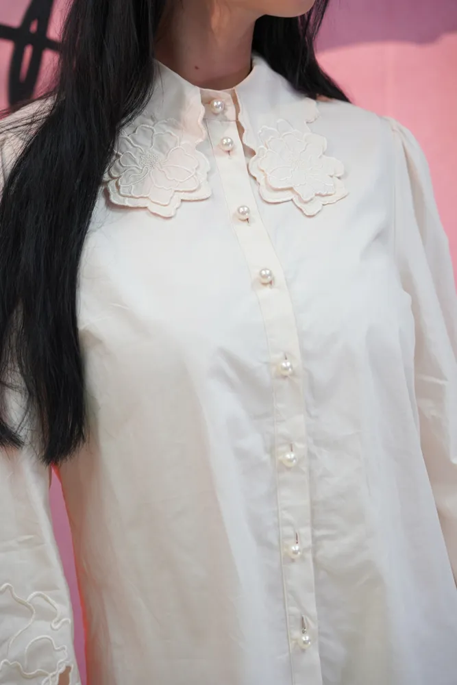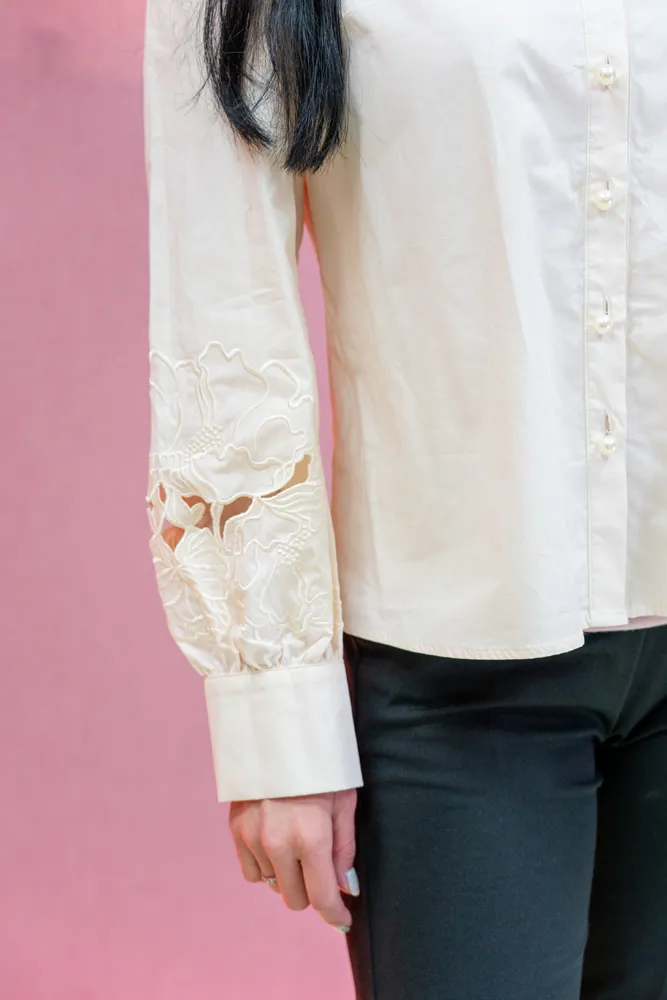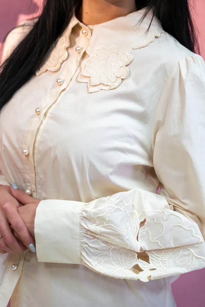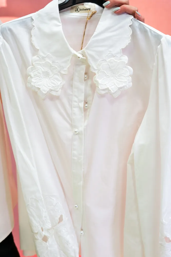 Vnesite pridih nežnosti in vintage elegance v svojo omaro z bluzo, ki očara na prvi pogled. Kos, ki je ustvarjen za ženske, ki cenijo unikatne detajle in želijo svojemu videzu dodati umetniški pečat. Osrednji del je bogato okrašen ovratnik s čudovitimi cvetličnimi aplikacijami, ki obrazu podarijo mehkobo, medtem ko diskretni biserni gumbi poskrbijo za pridih prestiža. Bluza je na voljo v dveh brezčasnih odtenkih: snežno beli za svež, klasičen videz in nežni bež za tiste, ki prisegate na toplejše, naravne tone. Izjemna pozornost je posvečena tudi manšetam, kjer se ponovi motiv cvetličnih vezav, kar omogoča, da bluza izstopa tudi takrat, ko jo nosite pod puloverjem ali suknjičem. Njen kroj je hkrati eleganten in udoben, lahkoten material pa zagotavlja, da se boste v njej počutili samozavestno skozi ves dan. Je popolna izbira za poslovne sestanke, kjer želite pustiti vtis prefinjenosti, ali za sproščena druženja ob kavi, ko jo kombinirate s svojimi najljubšimi kavbojkami. To ni le srajca, temveč modni dragulj, ki bo hitro postal vaš najljubši kos za posebne in vsakdanje priložnosti.