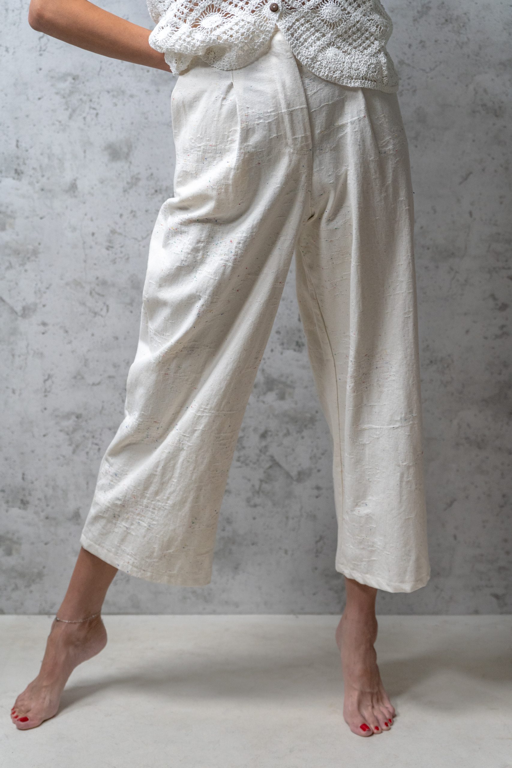 Športno- elegantne hlače v barvi smetane so popolna izbira za vse, ki prisegate na udobje in brezčasen stil. Izdelane so iz bombaža , ki s svojim unikatnim videzom in subtilnimi barvnimi nitkami dodaja pridih pristnosti ter ročne izdelave. Sodobno zasnovan visok pas in sproščen, širok kroj poskrbita za popolno prileganje in lahkotno gibanje skozi ves dan. Dolžina do gležnjev omogoča, da jih enostavno kombinirate tako s sandali za sproščen poletni videz kot tudi z elegantnimi čevlji za bolj dovršen videz. Gre za hlače, ki združujejo minimalizem, udobje in sofisticiranost – kos, ki ne sme manjkati v garderobi vsake ženske z občutkom za naravno eleganco.