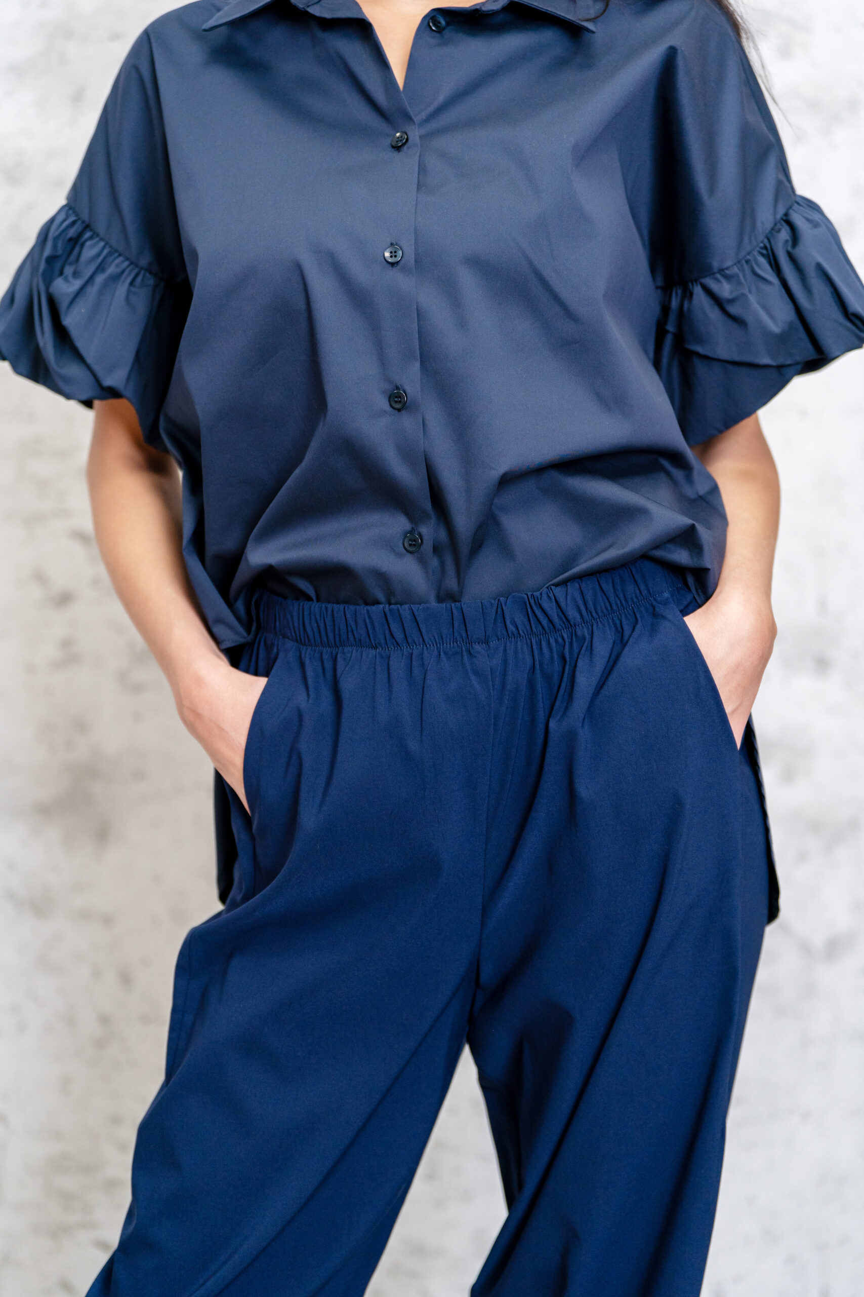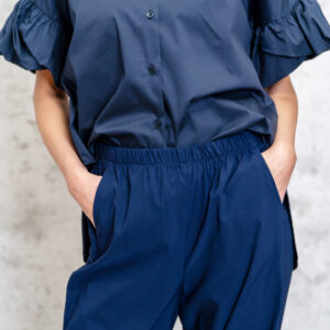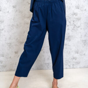 Temno modre hlače dolžine 7/8 so elegantne in vsestranske, idealne za vse letne čase. Zaradi krajšega kroja, ki sega do nekoliko nad gležnje, dajejo moderen in svež videz, hkrati pa poudarijo obutev. Temno modra barva je klasična in diskretna, kar omogoča enostavno kombiniranje z različnimi barvami in vzorci zgornjih delov. Takšne hlače so primerne tako za poslovne priložnosti kot za bolj sproščene, vsakodnevne stajlinge. Pogosto so narejene iz lahkega, udobnega materiala, ki omogoča dobro prileganje in gibljivost. Mešanica viskoze, naylona in elastana skrbi za zračnost in udobje.
