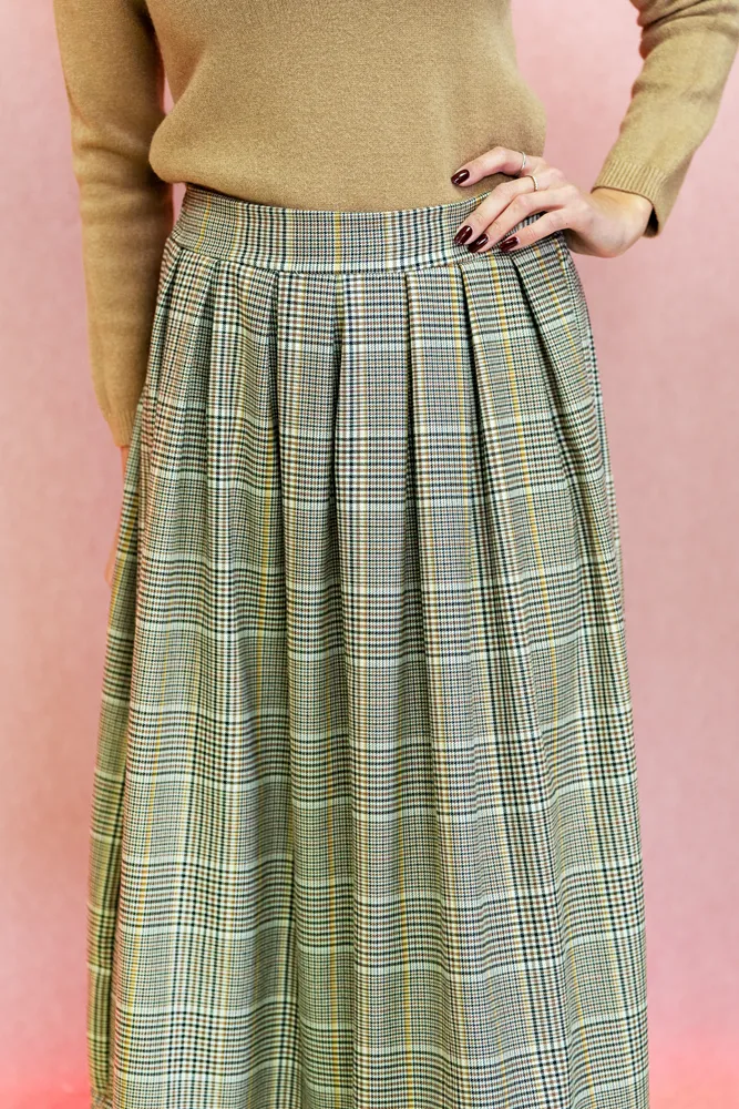 Športno- elegantno midi krilo s karo vzorcem združuje klasičen šarm in sodobno preprostost. Izdelano je iz mehke, udobne tkanine, ki je krojeno na A in lepo pade ob telesu. Karo vzorec v nevtralnih sivih in bež odtenkih daje krilu brezčasno eleganco, hkrati pa omogoča enostavno kombiniranje z različnimi barvami in kosi oblačil. Krilo sega do sredine meč, ima visok pas, ki poudari silhueto, in rahlo razširjen kroj, ki omogoča udobno gibanje. V pasu je elastika, kar omogoča prileganje in udobje. Popolno je za pisarniške kombinacije, vsakodnevne videze ali sproščene večerne priložnosti – nosi ga s pulijem in gležnjarji za klasičen videz ali s srajco in salonarji za bolj dodelan slog.