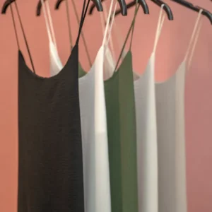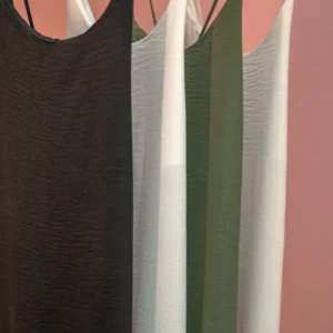 Enostavna poletna obleka je izjemno preprosta in elegantna v svoji minimalistični zasnovi. Narejena je iz gladke, svetle tkanine v nevtralnih odtenkih, kar ji daje zelo nevpadljiv, a sofisticiran videz. Kroj je raven, brez poudarka na pasu ali dodatnih detajlov, kar pomeni, da obleka naravno pada ob telesu in ustvarja zračen, sproščen občutek. Gre za klasično “slip” obleko – brez rokavov, z zelo tankimi naramnicami, ki poudarijo ramena in vrat ter ustvarijo subtilno zapeljivost brez pretiravanja. To je vsestranska obleka, ki jo je mogoče z lahkoto nositi na različne načine. Lahko jo oblečeš samostojno za sprehod po mestu, kot del slojevitih outfitov, na primer čez majico s kratkimi rokavi ali pod jopico, ali pa jo kombiniraš z elegantnimi dodatki in spremeniš v kos, primeren tudi za večerni izhod ali poletno zabavo. Zaradi nevtralnih barv in brezčasne silhuete je kos, ki ne bo šel iz mode in ga lahko nosiš iz leta v leto. V svoji preprostosti ta obleka deluje zelo ženstveno in brezčasno – kot prazno platno, ki čaka, da ga dopolniš po svojem okusu.