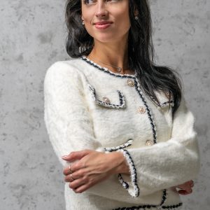 Elegantna jopa v črni ali beli barvi z okrasnim robom je modni kos, ki izžareva prefinjenost in stil. Njena enobarvna osnova omogoča enostavno kombiniranje z različnimi oblačili in barvami, medtem ko okrasni rob dodaja unikaten in sodoben pridih. Ta jopa je idealna za različne priložnosti – od poslovnih sestankov do večernih izhodov – in je odlična izbira za tiste, ki želijo izraziti svoj osebni stil z manjši naporom. Biserni gumbi pa dodajo piko na i za eleganten in bogat izgled.  Z njo boste zagotovo izstopali na vsakem dogodku.