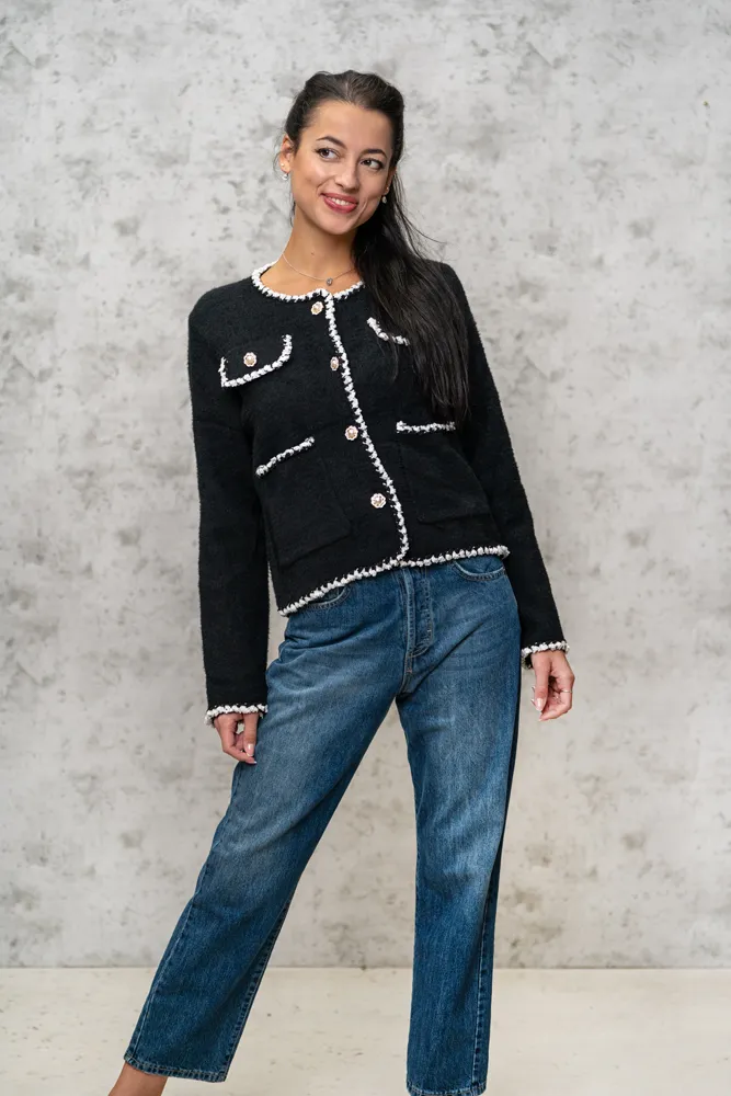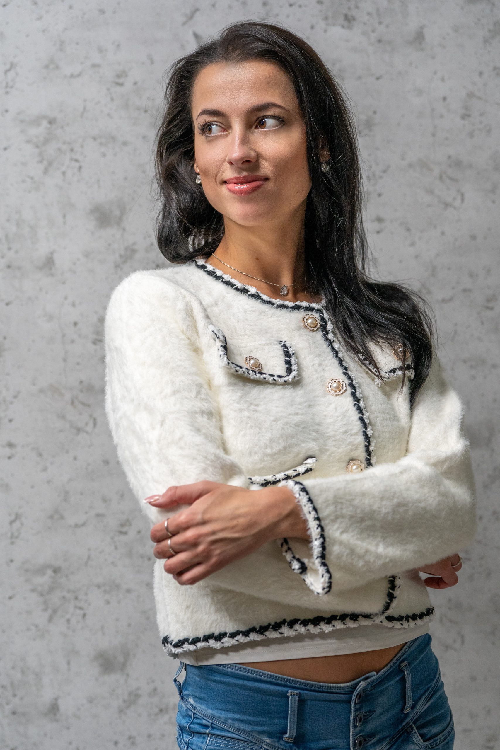 Elegantna jopa v črni ali beli barvi z okrasnim robom je modni kos, ki izžareva prefinjenost in stil. Njena enobarvna osnova omogoča enostavno kombiniranje z različnimi oblačili in barvami, medtem ko okrasni rob dodaja unikaten in sodoben pridih. Ta jopa je idealna za različne priložnosti – od poslovnih sestankov do večernih izhodov – in je odlična izbira za tiste, ki želijo izraziti svoj osebni stil z manjši naporom. Biserni gumbi pa dodajo piko na i za eleganten in bogat izgled.  Z njo boste zagotovo izstopali na vsakem dogodku.