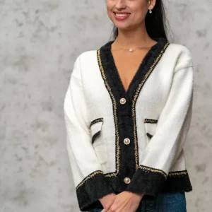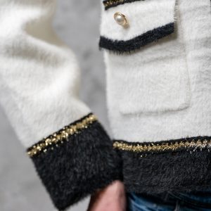 Elegantna črno-bela jopa z V-izrezom je popoln kos za tiste, ki iščejo prefinjenost in slog. Kontrast med črnimi in belimi toni ustvarja klasičen, a hkrati moden videz, ki ga lahko enostavno kombinirate z različnimi oblačili. V-izrez doda ženstvenost in tudi podaljša silhueto in lepo izpostavi vrat ter dekolte. Jopa je odlična izbira za raznorazne priložnosti, videz dopolnite z dodatki, kot so elegantni uhani ali nakit, da dosežete še bolj sofisticiran izgled.