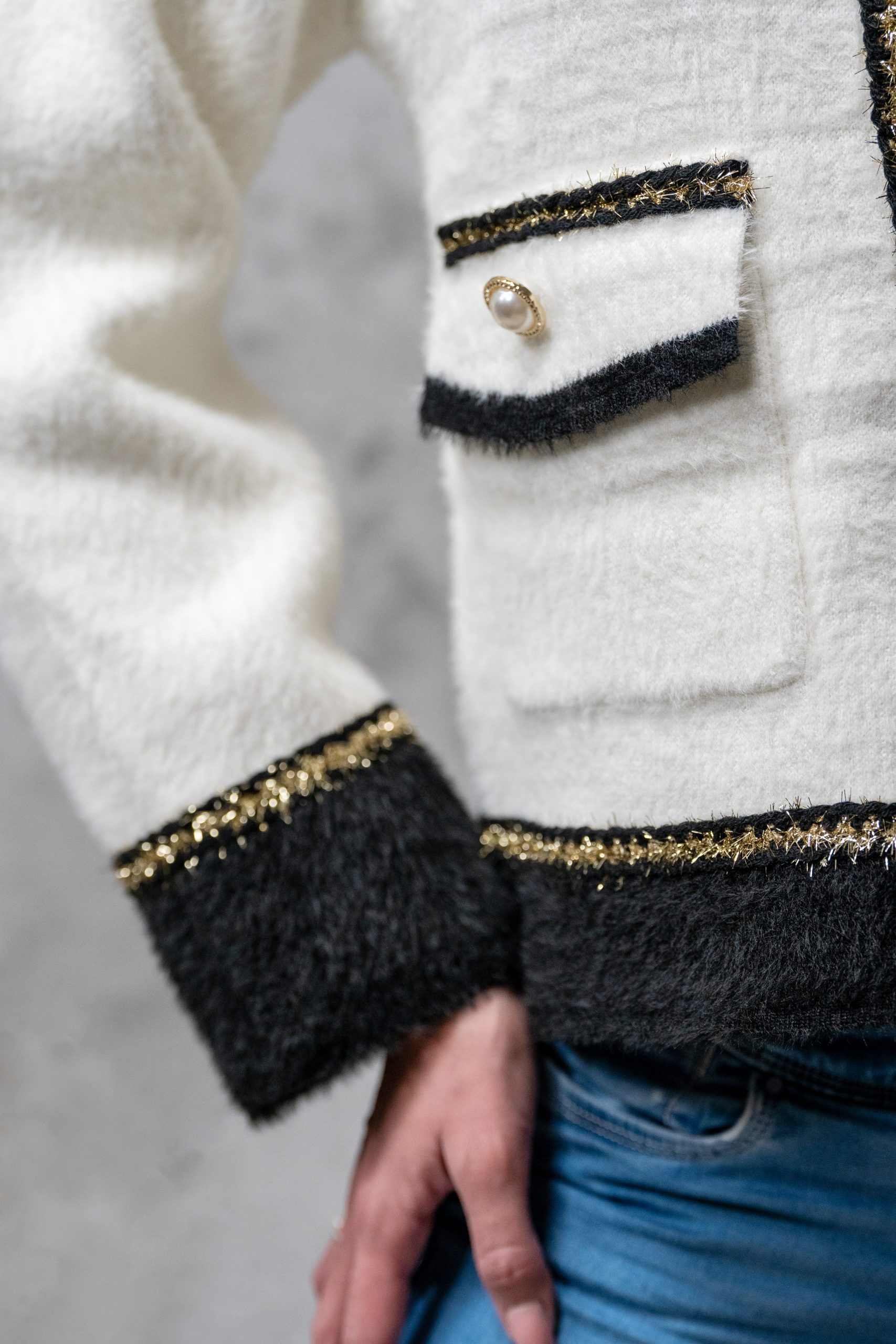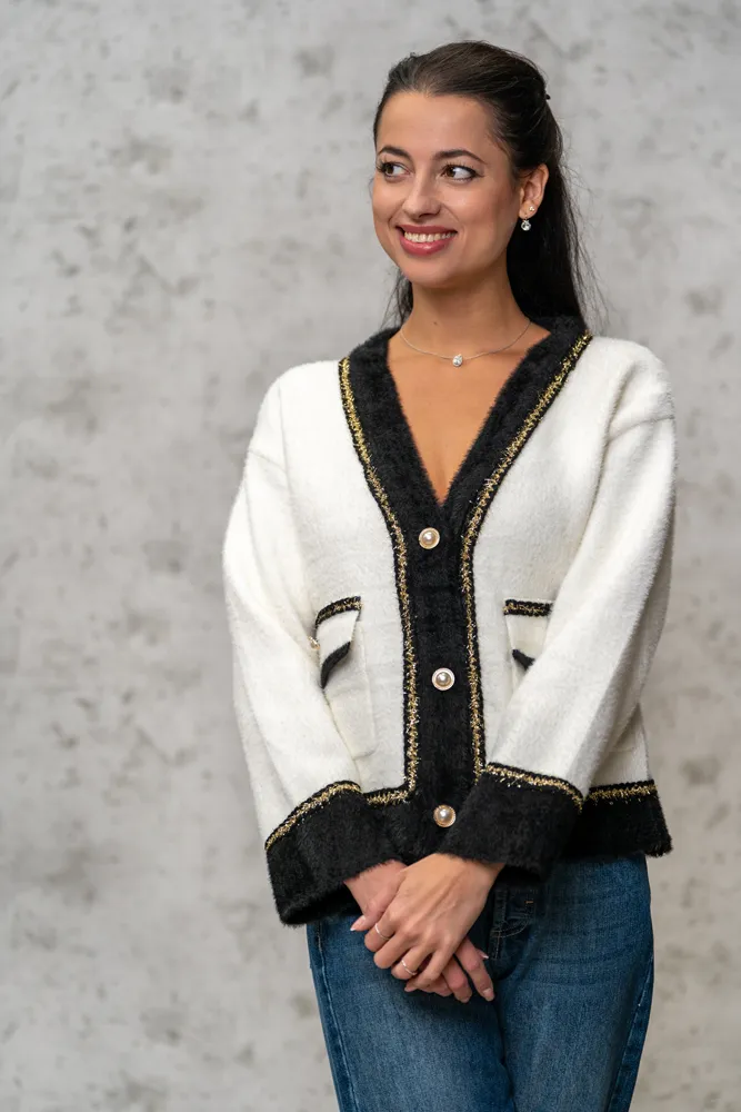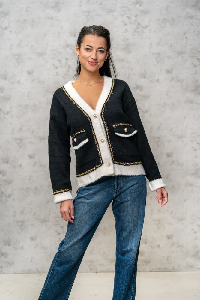 Elegantna črno-bela jopa z V-izrezom je popoln kos za tiste, ki iščejo prefinjenost in slog. Kontrast med črnimi in belimi toni ustvarja klasičen, a hkrati moden videz, ki ga lahko enostavno kombinirate z različnimi oblačili. V-izrez doda ženstvenost in tudi podaljša silhueto in lepo izpostavi vrat ter dekolte. Jopa je odlična izbira za raznorazne priložnosti, videz dopolnite z dodatki, kot so elegantni uhani ali nakit, da dosežete še bolj sofisticiran izgled.