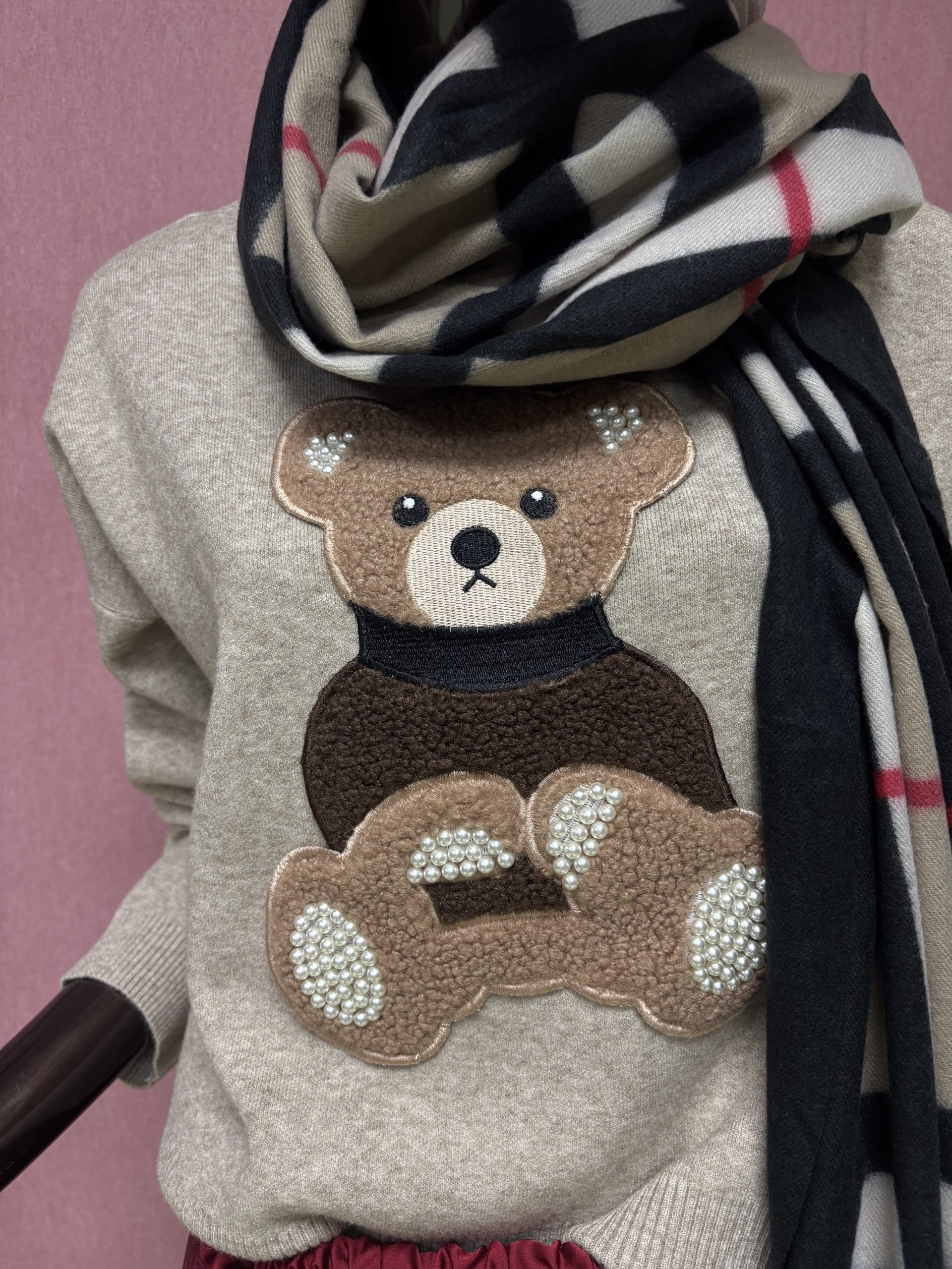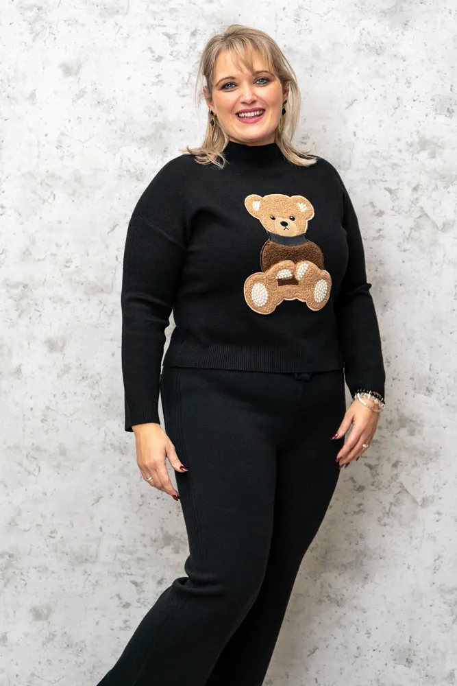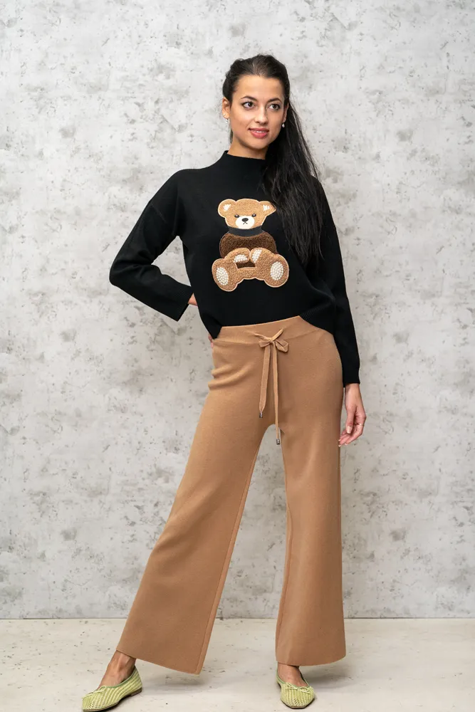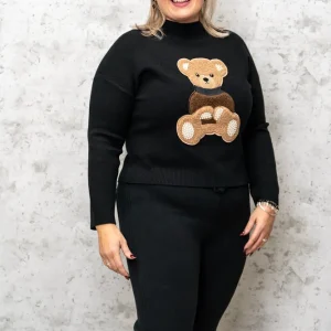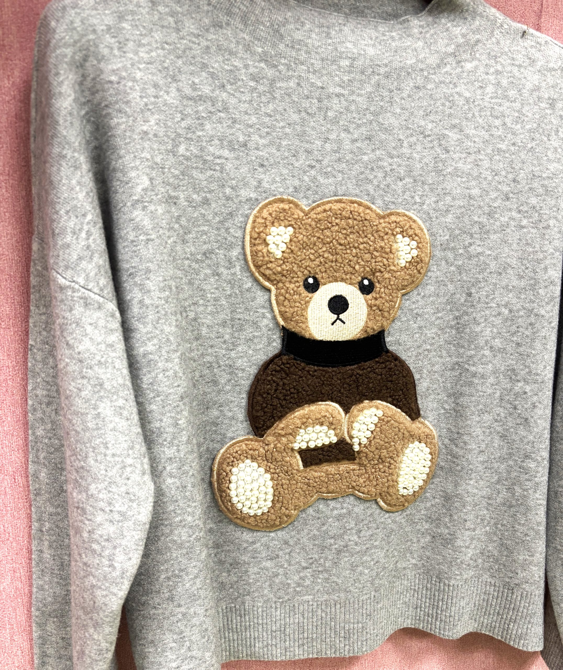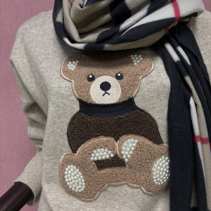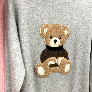 Pulover je udoben in topel kos oblačila izdelan iz naravnih materialov, ki zagotavlja prijetno nošenje skozi cel dan. Na sprednji strani puloverja se nahaja ljubek našitek v obliki medvedka, ki daje puloverju igriv in srčkan pridih. Medvedek je lahko v različnih barvah, kar omogoča izbiro glede na osebni stil ali razpoloženje. Rahlo širši model, ki se prilagodi glede na vaš prsni obseg.